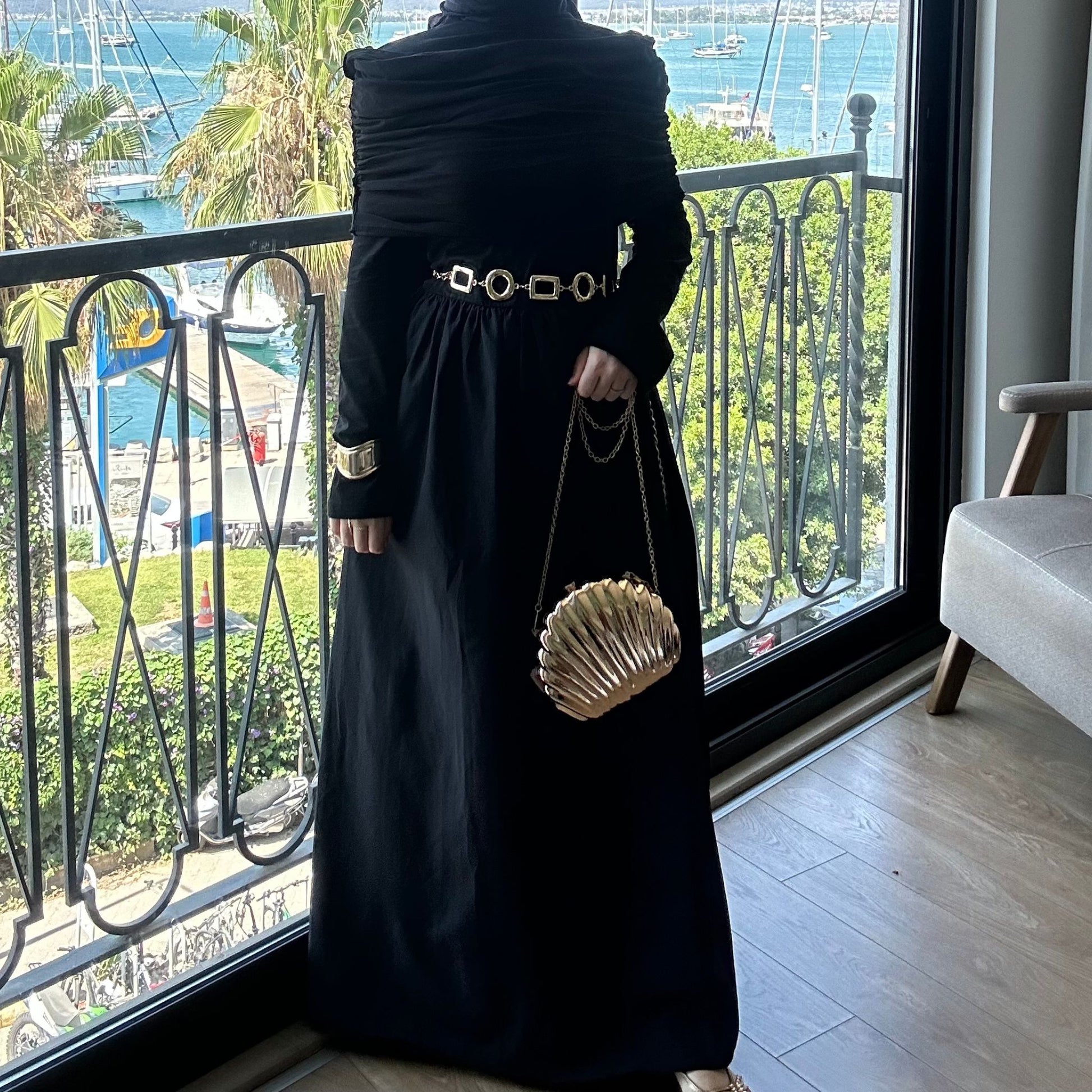 A striking black maxi dress featuring soft ruching at the waist and elegant draped detailing around the neckline and shoulders.Ideal for formal evenings,special occasions,or modest chic looks.